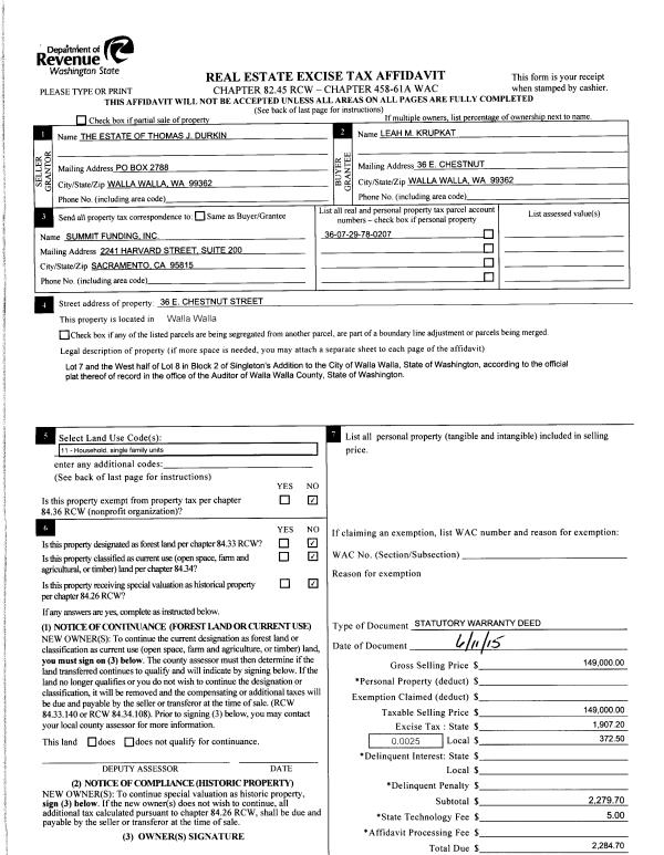 | 1 | 06/12/2015 | SWD | STATUTORY WARRANTY DEED | DURKIN THOMAS J ESTATE OF | KRUPKAT LEAH M | | | $149,000.00 | 128165 | 2015-04974 |