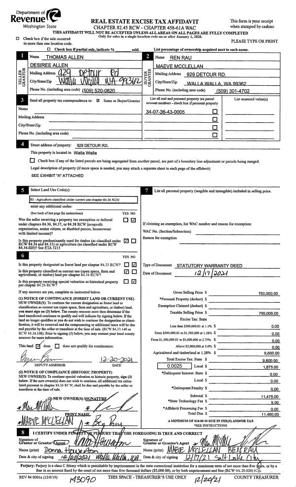 | Mailing Address: | 929 DETOUR RD WALLA WALLA, WA 99362 | % Ownership: | 100.0000000000% |