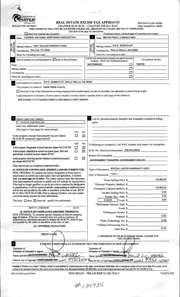 | 4 | 11/04/2011 | WARRANTY D | WARRANTY DEED | FEDERAL NATIONAL MORTGAGE ASSO | PONTI, BRYAN | | | $124,900.00 | 120935 | 2011-08712 |