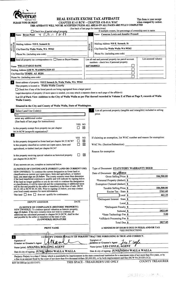 | 3 | 06/25/2014 | SWD | STATUTORY WARRANTY DEED | PONTI BRYAN | LEWIS CAMERON | | | $184,500.00 | 126132 | 2014-04385 |