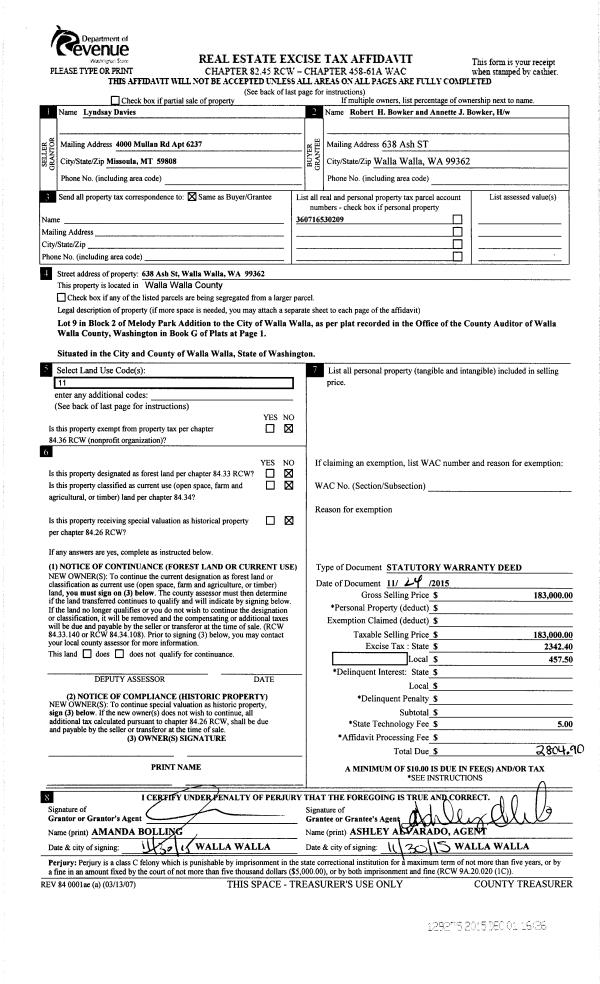 | 3 | 12/01/2015 | SWD | STATUTORY WARRANTY DEED | HOBDE LYNDSAY | BOWKER ROBERT H & ANNETTE J | | | $183,000.00 | 129275 | 2015-10327 |