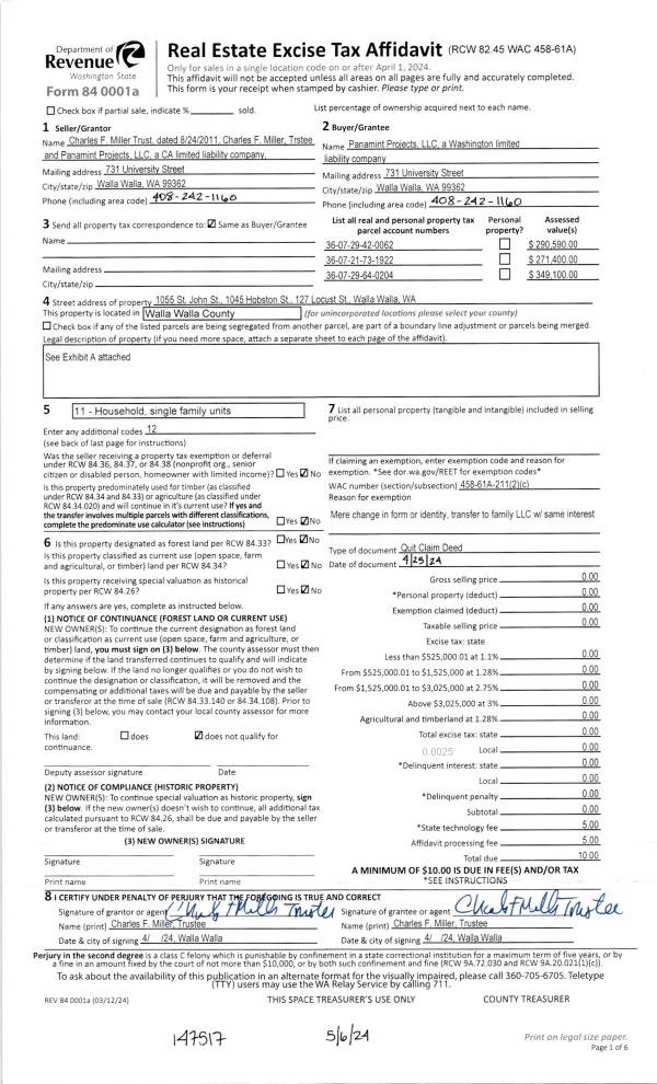 | 1 | 05/06/2024 | QCD | QUIT CLAIM DEED | PANAMINT PROJECTS LLC | PANAMINT PROJECTS LLC | | | | 147517 | 2024-02366 |