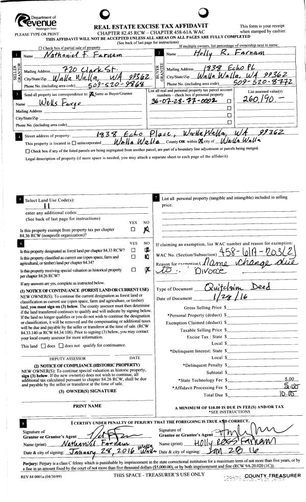 | 1 | 01/28/2016 | QCD | QUIT CLAIM DEED | FARNAM NATHANIEL F & HOLLY A | FARNAM HOLLY ROSS | | | $0.00 | 129579 | 2016-00663 |