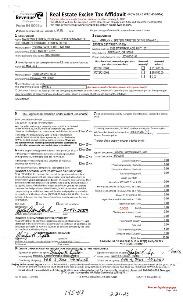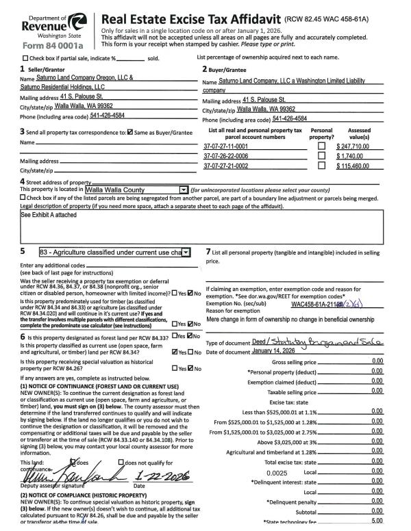 | 1 | 09/22/2023 | SWD | STATUTORY WARRANTY DEED | THE EDWARD L EPSTEIN GST TRUST ET AL | SATURNO LAND COMPANY OREGON LLC | | 3-PARCELS | $1,700,000.00 | 146559 | 2023-05731 |