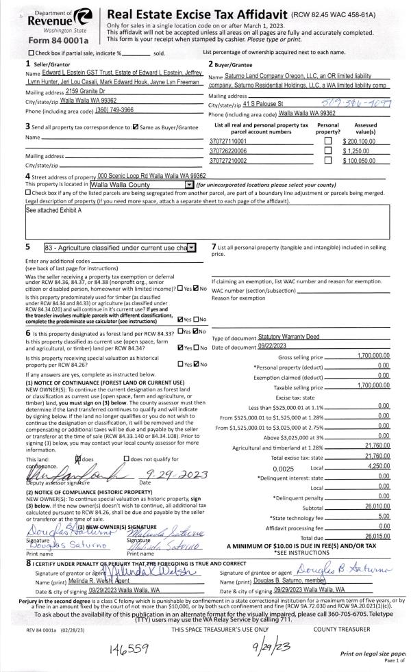 | 1 | 09/22/2023 | SWD | STATUTORY WARRANTY DEED | THE EDWARD L EPSTEIN GST TRUST ET AL | SATURNO LAND COMPANY OREGON LLC | | 3-PARCELS | $1,700,000.00 | 146559 | 2023-05731 |