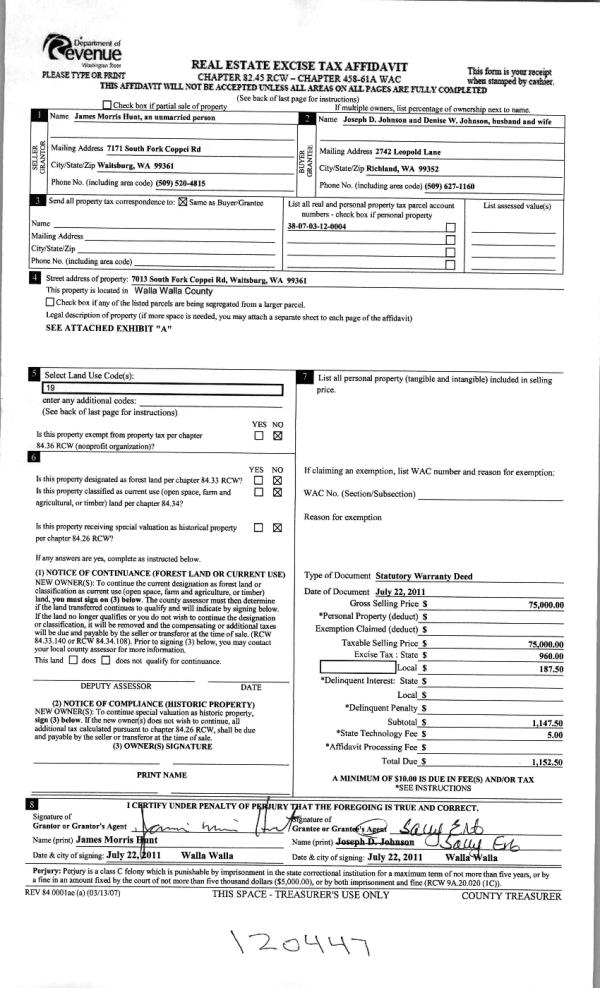 | 1 | 07/22/2011 | WARRANTY D | WARRANTY DEED | HUNT, JAMES MORRIS | JOHNSON, JOSEPH D & DENISE W | | | $75,000.00 | 120447 | 2011-05709 |