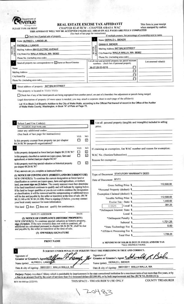 | 3 | 08/01/2011 | WARRANTY D | WARRANTY DEED | LANGIS, ALFRED L JR | BIEKER, GERALD L & DIANA K | | | $112,500.00 | 120483 | 2011-05937 |