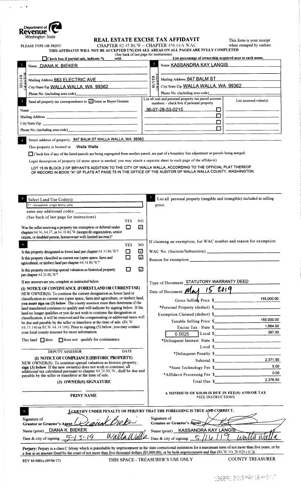 | 1 | 05/16/2019 | SWD | STATUTORY WARRANTY DEED | BIEKR DIANA | LANGIS KASSANDRA KAY | | | $155,000.00 | 136891 | 2019-03280 |