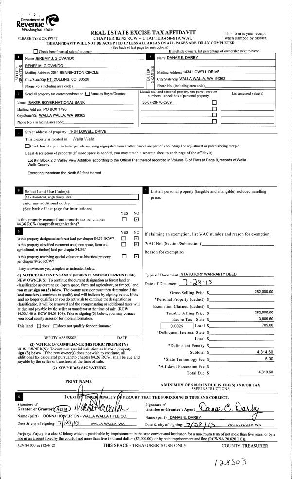 | 2 | 07/30/2015 | SWD | STATUTORY WARRANTY DEED | GIOVANDO JEREMY & RENEE | DARBY DANAE E | | | $282,000.00 | 128503 | 2015-06548 |
