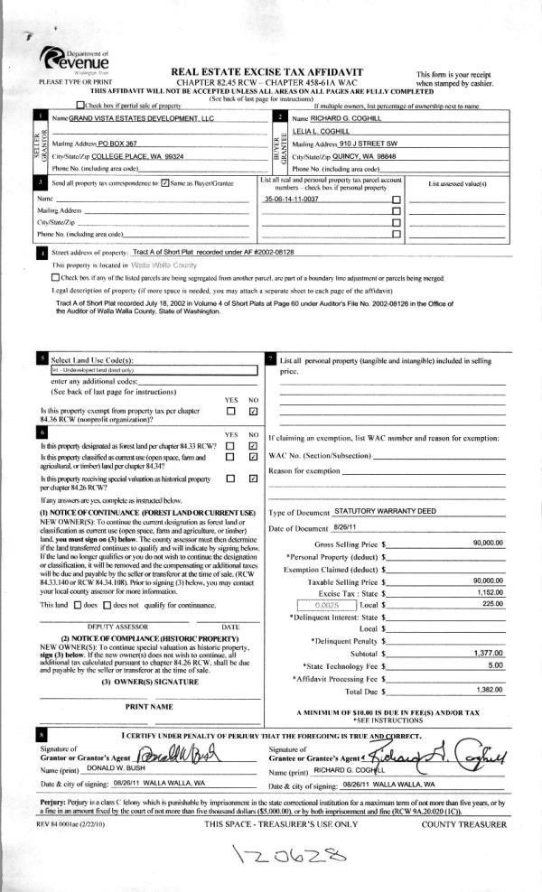 | 1 | 08/31/2011 | WARRANTY D | WARRANTY DEED | GRAND VISTA ESTATES DEV LLC | COGHILL, RICHARD G & LELIA L | | | $90,000.00 | 120628 | 2011-06834 |