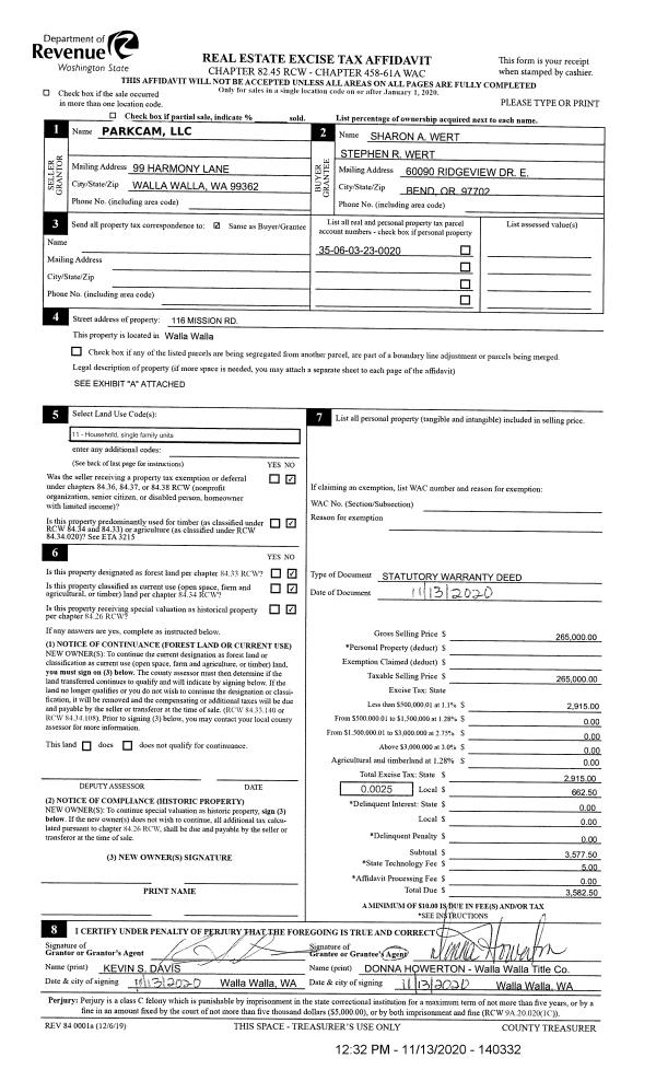 | 4 | 11/13/2020 | SWD | STATUTORY WARRANTY DEED | PARKCAM LLC | WERT SHARON A & STEPHEN R | | | $265,000.00 | 140332 | 2020-11980 |