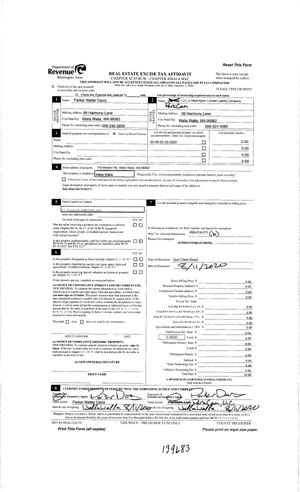 | 5 | 08/11/2020 | QCD | QUIT CLAIM DEED | DAVIS PARKER WALTER | PARKCAM LLC | | | $0.00 | 139683 | 2020-07908 |