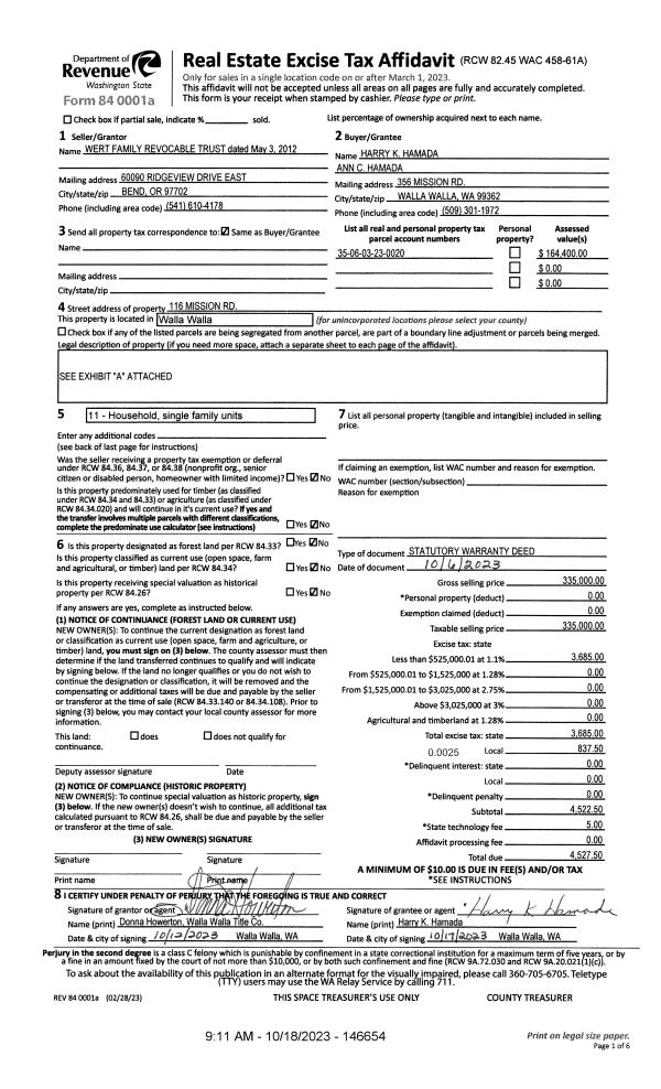 | 1 | 10/18/2023 | SWD | STATUTORY WARRANTY DEED | WERT FAMILY REVOCABLE TRUST | HAMADA HARRY K & ANN C | | | $335,000.00 | 146654 | 2023-06124 |