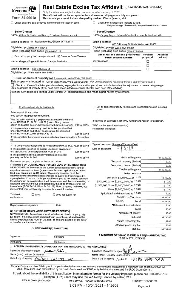 | 1 | 10/04/2021 | SWD | STATUTORY WARRANTY DEED | NOLDNER WILLIAM D & BEVERLY S | HOLM GREGORY EUGENE & CAROLYN SUE | | | $500,000.00 | 142608 | 2021-12112 |