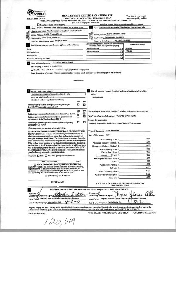| 4 | 08/29/2011 | QCD | QUIT CLAIM DEED | ALLEN STEPHEN & MARIE TRUSTEES | ALLEN STEPHEN LEON & MARIE YOLANDA | | | | 120612 | 2011-06769 |