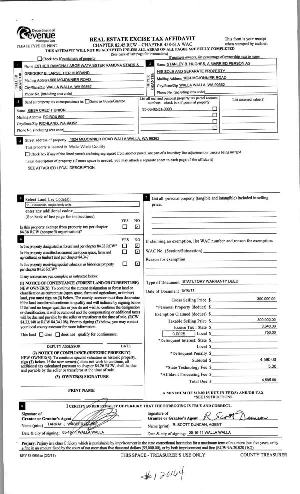 | 4 | 05/20/2011 | WARRANTY D | WARRANTY DEED | LARGE, ESTHER R STARR | HUGHES, STANLEY B | | | $300,000.00 | 120164 | 2011-03958 |