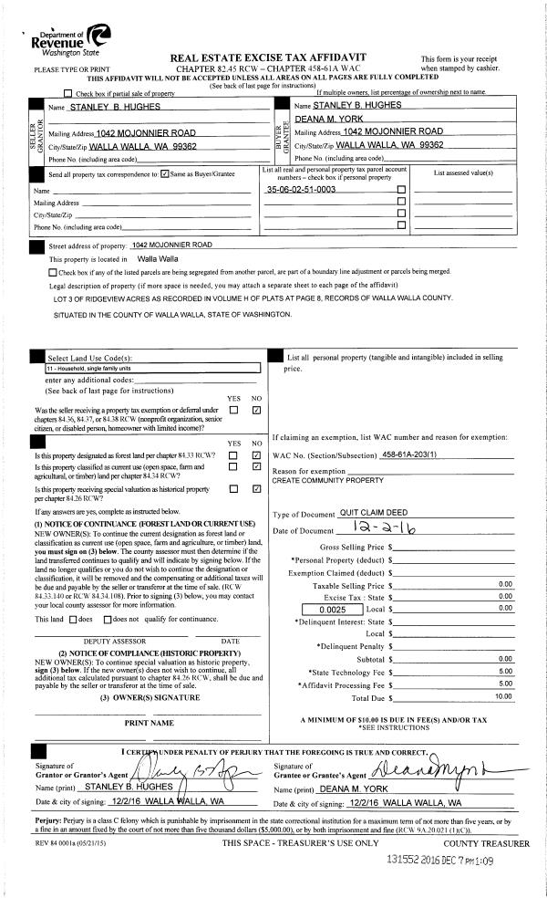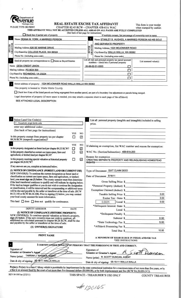 | 3 | 05/20/2011 | QCD | QUIT CLAIM DEED | DEANA M YORK | HUGHES, STANLEY B | | | $0.00 | 120165 | 2011-03959 |