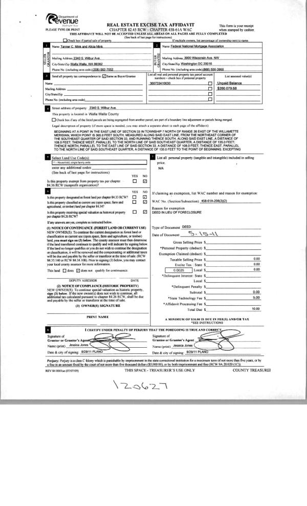 | 2 | 08/30/2011 | WARRANTY D | WARRANTY DEED | MINK, TANNER C & ALICIA | FEDERAL NATIONAL MORTAGE ASSOC | | | | 120627 | 2011-06831 |