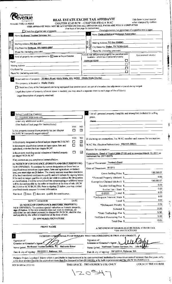 | 3 | 08/15/2011 | WARRANTY D | WARRANTY DEED | NORTHWEST TRUSTEE SERVICES INC | FEDERAL NATIONAL MORTGAGE~ASSO | | | $136,050.00 | 120547 | 2011-06365 |