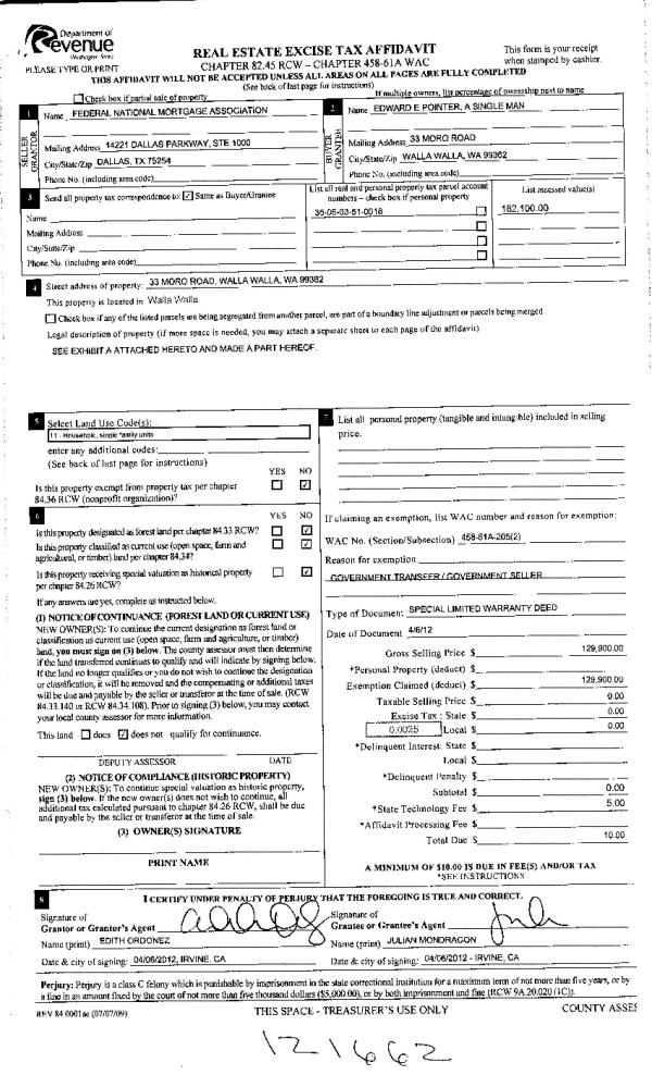 | 2 | 04/11/2012 | WARRANTY D | WARRANTY DEED | FEDERAL NATIONAL MORTGAGE ASSO | POINTER, EDWARD E | | | $129,900.00 | 121662 | 2012-02937 |