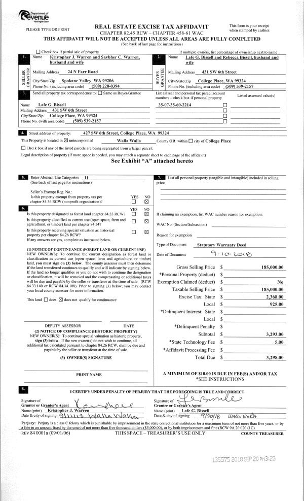 | 1 | 09/20/2018 | SWD | STATUTORY WARRANTY DEED | WARREN KRISTOPHER J & SAYBHER C | BISSELL LAFE & REBECCA L | | | $185,000.00 | 135575 | 2018-07839 |