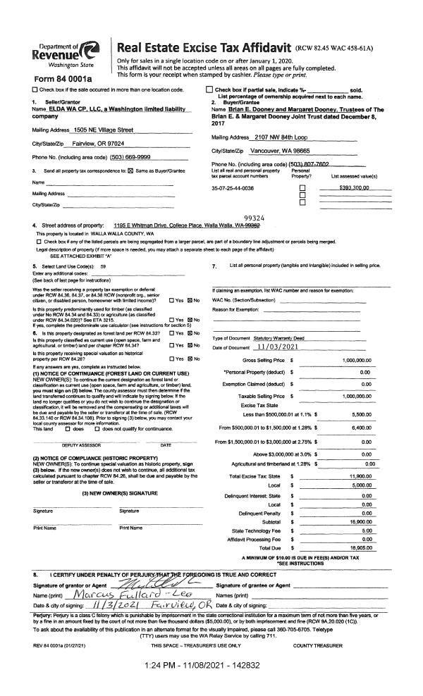 | 1 | 11/08/2021 | SWD | STATUTORY WARRANTY DEED | ELDA WA CP LLC | BRIAN E & MARGARET DOONEY JOINT TRUST | | | $1,000,000.00 | 142832 | 2021-13365 |