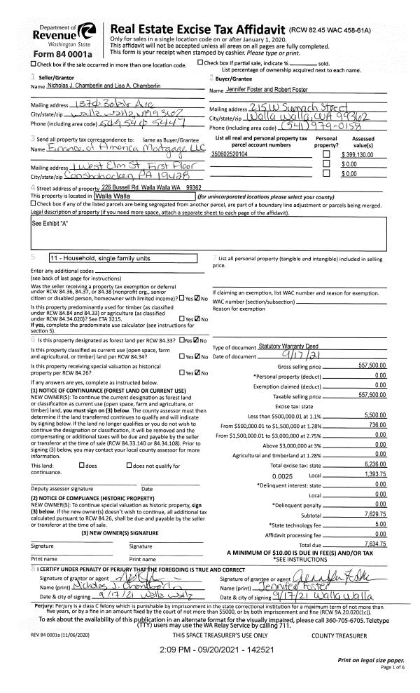 | 1 | 09/20/2021 | SWD | STATUTORY WARRANTY DEED | CHAMBERLIN NICHOLAS J & LISA A | FOSTER JENNIFER & ROBERT | | | $557,500.00 | 142521 | 2021-11544 |