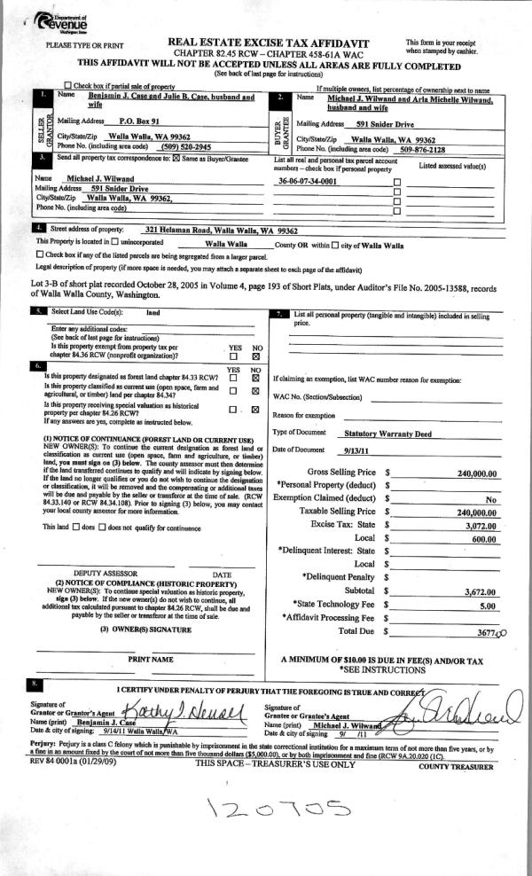 | 3 | 09/16/2011 | WARRANTY D | WARRANTY DEED | CASE, BENJAMIN & JULIE | WILWAND, MICHAEL J & ARLA MICH | | | $240,000.00 | 120705 | 2011-07240 |
