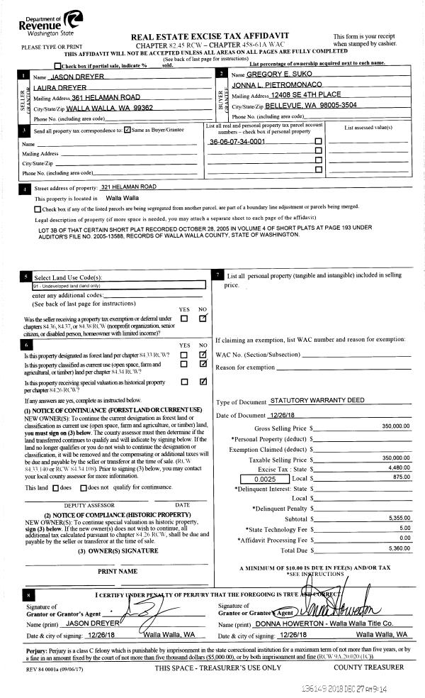 | 1 | 12/27/2018 | SWD | STATUTORY WARRANTY DEED | DREYER JASON & LAURA | SUKO GREGORY E | | | $350,000.00 | 136149 | 2018-10627 |