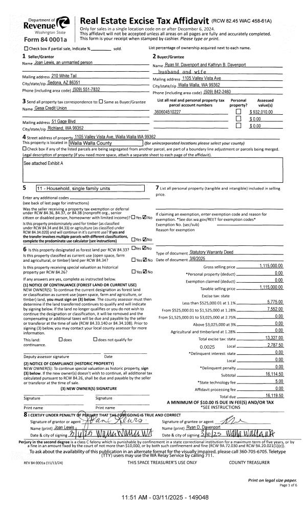 | 1 | 03/11/2025 | SWD | STATUTORY WARRANTY DEED | LEWIS JOAN | DAVENPORT RYAN M & KATHRYN B | | | $1,115,000.00 | 149048 | 2025-01267 |