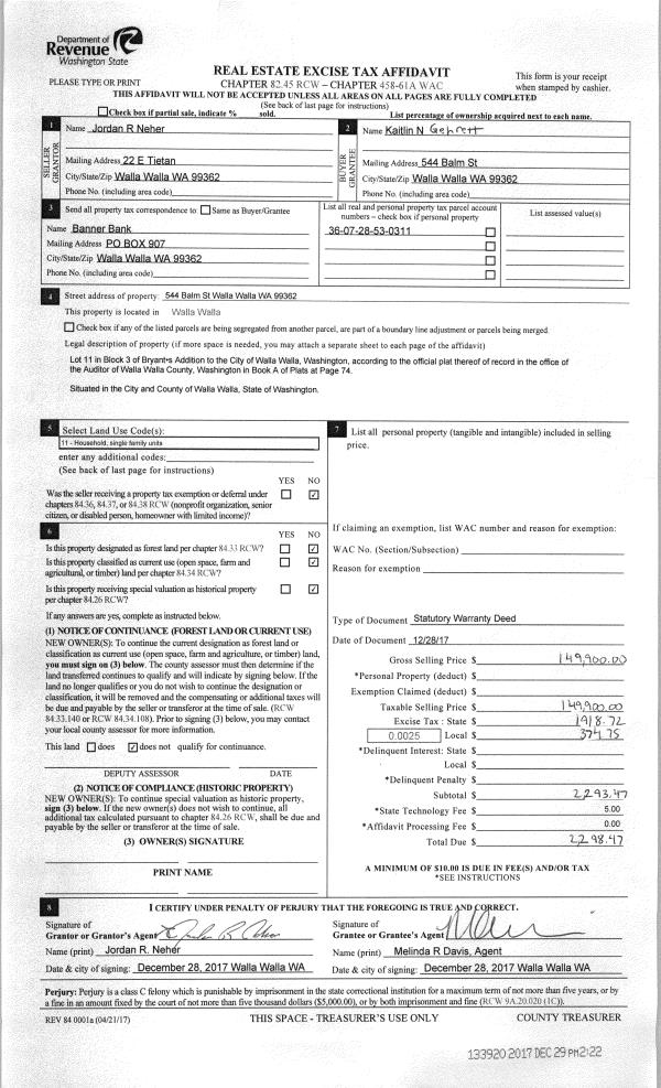 | 1 | 12/29/2017 | SWD | STATUTORY WARRANTY DEED | NEHER JORDAN R & ALICIA A | GEHRETT KAITLIN N | | | $149,900.00 | 133920 | 2017-10513 |