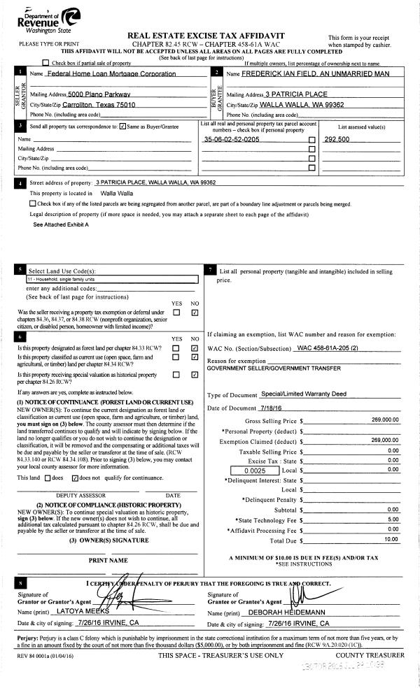 | 1 | 07/28/2016 | SWP | Special Warranty Deed | FEDERAL HOME LOAN MORTGAGE CORP | FIELD FREDERICK I | | | $269,000.00 | 130708 | 2016-05902 |