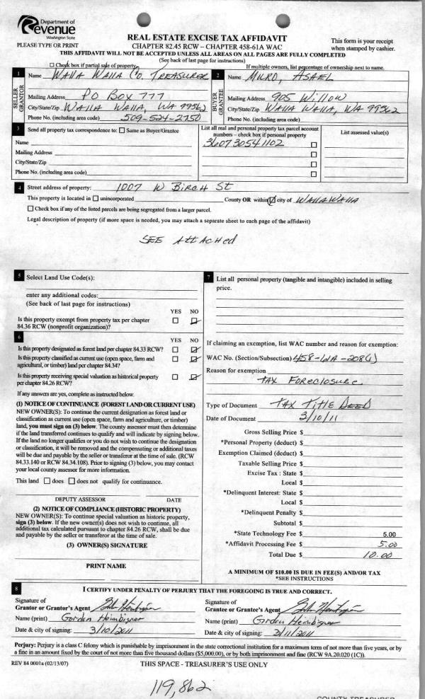 | 2 | 03/10/2011 | WARRANTY D | WARRANTY DEED | WALLA WALLA COUNTY WASHINGTON | MURO, ASAEL | | | $13,000.00 | 119862 | 2011-02156 |