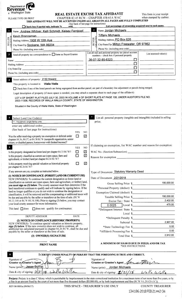 | 2 | 02/21/2018 | SWD | STATUTORY WARRANTY DEED | WHITVER ANDREW ET AL | MICHAELS JORDAN C & TIFFANY N | | | $190,000.00 | 134186 | 2018-01442 |
