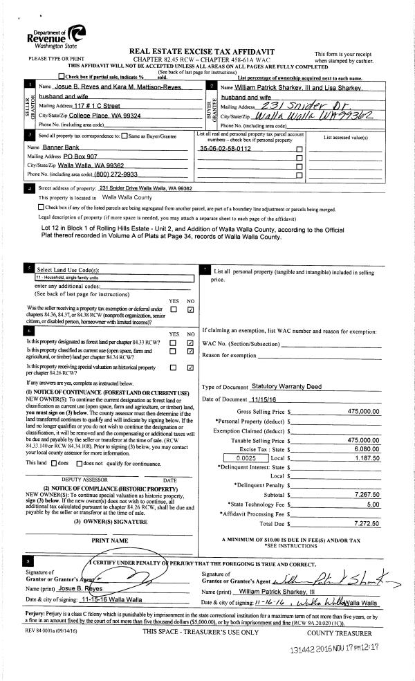 | 1 | 11/17/2016 | SWD | STATUTORY WARRANTY DEED | REYES JOSUE B | SHARKEY WILLIAM PATRICK III & LISA | | | $475,000.00 | 131442 | 2016-09497 |