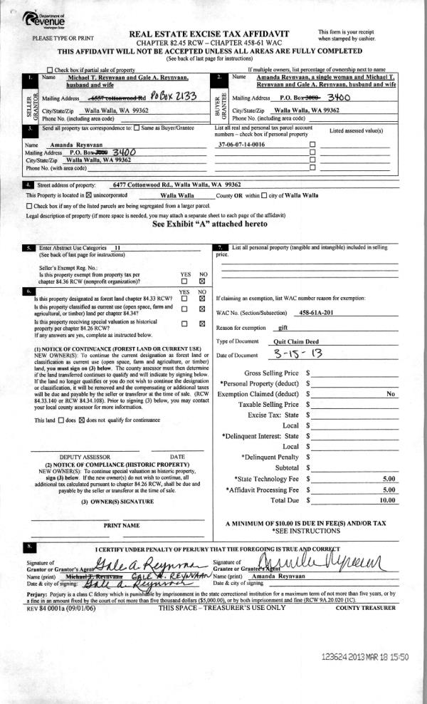 | 2 | 03/18/2013 | QCD | QUIT CLAIM DEED | REYNVAAN, MICHAEL T & GALE A | REYNVAAN, AMANDA | | | $0.00 | 123624 | 2013-02551 |