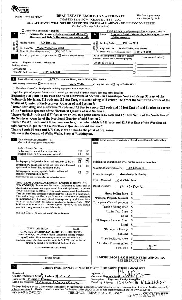 | 1 | 12/15/2016 | QCD | QUIT CLAIM DEED | REYNVAAN AMANDA | FAMILY VINEYARDS LLC | | | $0.00 | 131607 | 2016-10368 |