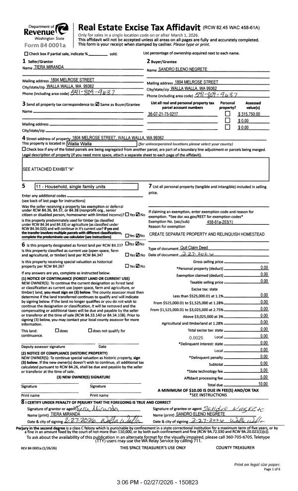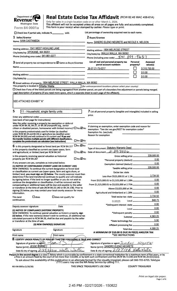 | Mailing Address: | 1804 MELROSE ST WALLA WALLA, WA 99362 | % Ownership: | 100.0000000000% |