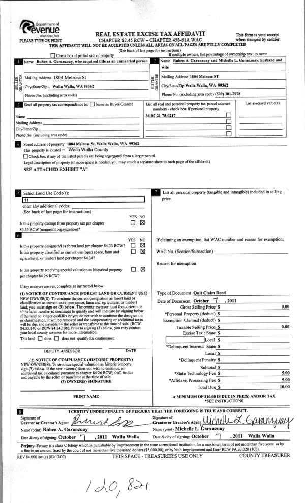| 3 | 10/13/2011 | QCD | QUIT CLAIM DEED | GARANZUAY, RUBEN | GARANZUAY RUBEN A & MICHELLE L | | | | 120821 | 2011-08022 |