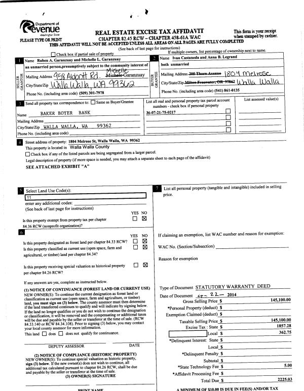| 2 | 04/23/2014 | SWD | STATUTORY WARRANTY DEED | GARANZUAY RUBEN A & MICHELLE L | CASTANEDA IVAN | | | $145,100.00 | 125749 | 2014-02732 |