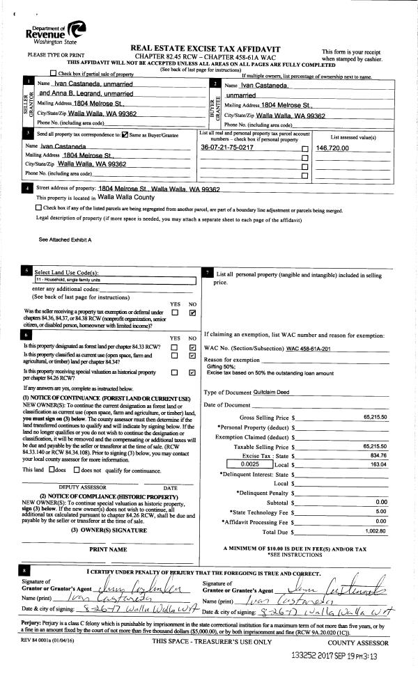 | 1 | 09/19/2017 | QCD | QUIT CLAIM DEED | CASTANEDA IVAN | CASTANEDA IVAN | | | $65,216.00 | 133252 | 2017-07399 |