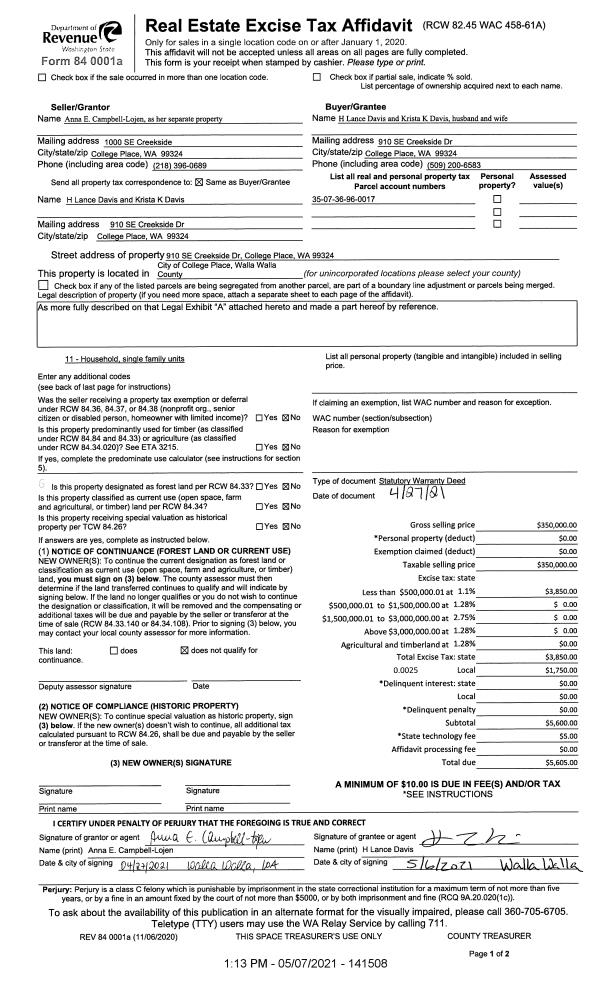 | 1 | 05/07/2021 | SWD | STATUTORY WARRANTY DEED | CAMPBELL LOJEN ANNA E | DAVIS H LANCE & KRISTA K | | | $350,000.00 | 141508 | 2021-05522 |