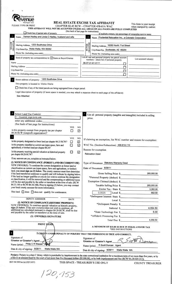 | 3 | 09/28/2011 | WARRANTY D | WARRANTY DEED | HADLEY, VERNON & LINDA C | PRUDENTIAL RELOCATION INC | | | $265,000.00 | 120753 | 2011-07577 |