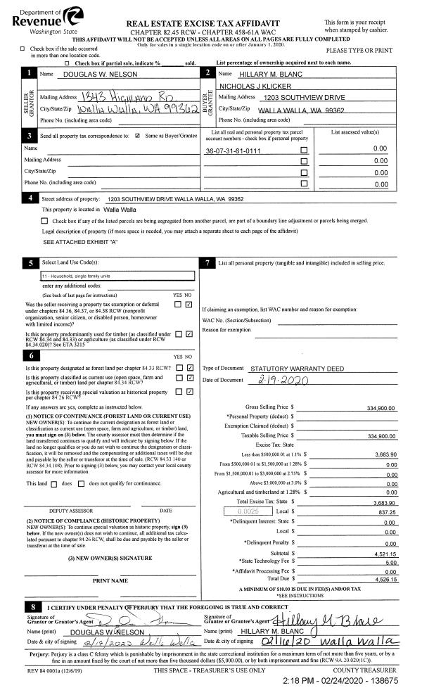 | 1 | 02/19/2020 | SWD | STATUTORY WARRANTY DEED | NELSON DOUGLAS W | BLANC HILLARY M & NICHOLAS J KLICKER | | 2-PARCLES | $334,900.00 | 138675 | 2020-01701 |