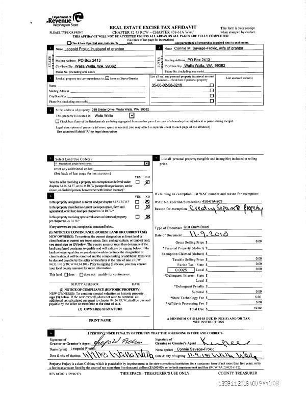 | 2 | 11/09/2018 | QCD | QUIT CLAIM DEED | FROKIC LEOPOLD | SAVAGE-FROKIC CONNIE | | | | 135911 | 2018-09327 |