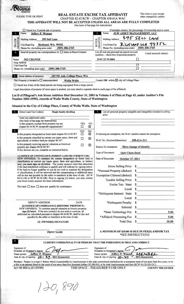 | 2 | 10/28/2011 | QCD | QUIT CLAIM DEED | WENNER, JEFFERY P | JLW ASSET MANAGEMENT LLC | | | | 120890 | 2011-08441 |
