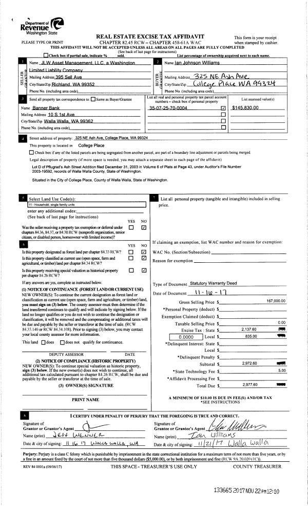 | 1 | 11/22/2017 | SWD | STATUTORY WARRANTY DEED | JLW ASSET MANAGEMENT LLC | WILLIAMS IAN JOHNSON | | | $167,000.00 | 133665 | 2017-09421 |