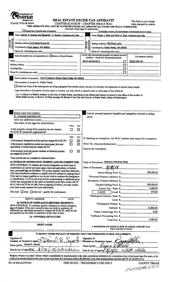 | 2 | 03/18/2015 | SWD | STATUTORY WARRANTY DEED | SPARKS DANIEL R & ELIZABETH A | BLAIR ROGER J & RUTH A | | | $350,000.00 | 127619 | 2015-02273 |