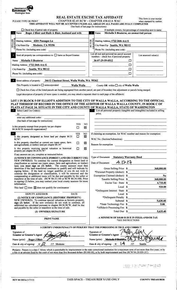 | 1 | 04/17/2017 | SWD | STATUTORY WARRANTY DEED | BLAIR ROGER J & RUTH A | BOUTERSE MICHELLE S | | | $368,000.00 | 132213 | 2017-02827 |