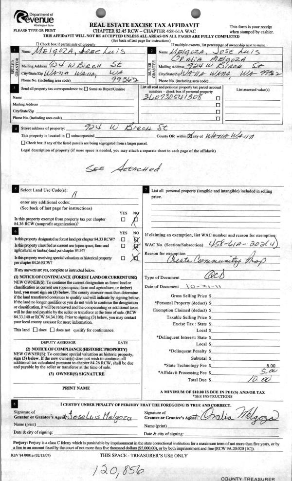 | 1 | 10/21/2011 | QCD | QUIT CLAIM DEED | MELGOZA, JOSE LUIS | MELGOZA, JOSE LUIS & ORALIA | | | | 120856 | 2011-08238 |
